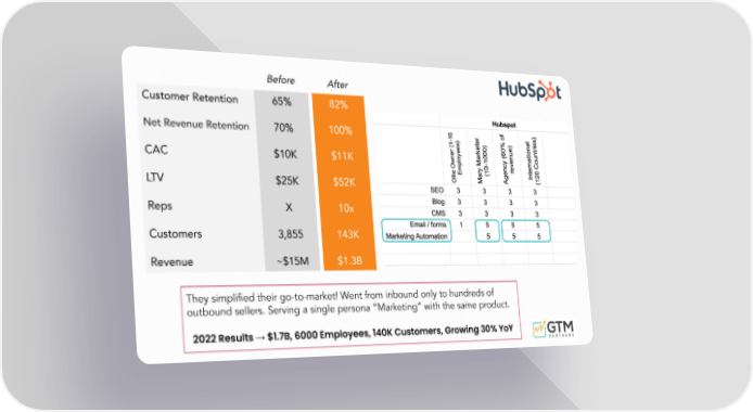 @sangramvajre @sangramvajre Customer Retention Net Revenue Retention CAC LTV Reps Customers Revenue 65% 70% $10K $25K X 3,855 ~$15M 82% 100% $11K $52K 10x 143K $1.3B Before After They simplified their go-to-market! Went from inbound only to hundreds of outbound sellers. Serving a single persona “Marketing” with the same product. 2022 Results → $1.7B, 6000 Employees, 140K Customers, Growing 30% YoY