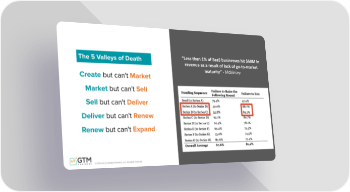© 2022 Go To Market Partners, LLC. All rights reserved. Create but can't Market Market but can't Sell Sell but can't Deliver Deliver but can't Renew Renew but can't Expand The 5 Valleys of Death “Less than 1% of SaaS businesses hit $50M in revenue as a result of lack of go-to-market maturity” - Mckinsey
