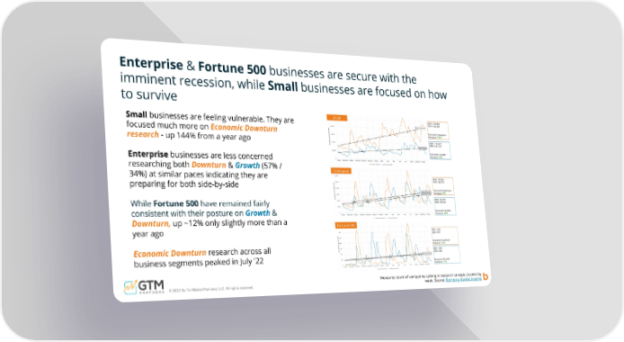 Enterprise & Fortune 500 businesses are secure with the imminent recession, while Small businesses are focused on how to survive Small businesses are feeling vulnerable. They are focused much more on E c o n o m i c D o w n t u r n r e s e a r c h - up 144% from a year ago While Fortune 500 have remained fairly consistent with their posture on G r o w t h & D o w n t u r n , up ~12% only slightly more than a year ago © 2022 Go To Market Partners, LLC. All rights reserved. Enterprise businesses are less concerned researching both D o w n t u r n & G r o w t h (57% / 34%) at similar paces indicating they are preparing for both side-by-side E c o n o m i c D o w n t u r n research across all business segments peaked in July '22 Measures count of companies spiking in research on topic clusters by week. Source: Bombora Market Insight s
