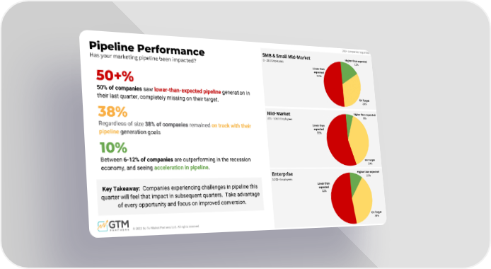 S M B & S m a l l M i d - M a r k e t 0 - 2 5 0 E m p l o y e e s E n t e r p r i s e 1 0 0 1 + E m p l o y e e s M i d - M a r k e t 2 5 1 - 1 0 0 0 E m p l o y e e s Pipeline Performance H a s y o u r m a r k e t i n g p i p e l i n e b e e n i m p a c t e d ? 50% of companies saw lower-than-expected pipeline generation in their last quarter, completely missing on their target. Regardless of size 38% of companies remained on track with their pipeline generation goals 38% 50+% Between 6-12% of companies are outperforming in the recession economy, and seeing acceleration in pipeline . 10% Key Takeaway: Companies experiencing challenges in pipeline this quarter will feel that impact in subsequent quarters. Take advantage of every opportunity and focus on improved conversion. © 2022 Go To Market Partners, LLC. All rights reserved. Lower than expected 52% Higher than expected 10% On Target 38% Lower than expected 50% Higher than expected 12% On Target 38% Lower than expected 55% Higher than expected 6 % On Target 39% 300+ companies responded