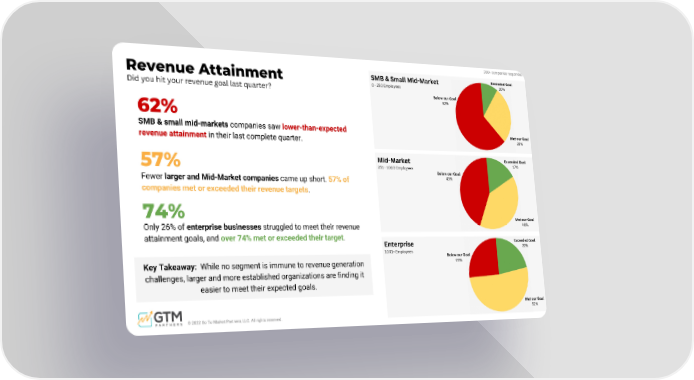 E n t e r p r i s e 1 0 0 1 + E m p l o y e e s S M B & S m a l l M i d - M a r k e t 0 - 2 5 0 E m p l o y e e s M i d - M a r k e t 2 5 1 - 1 0 0 0 E m p l o y e e s Revenue Attainment D i d y o u h i t y o u r r e v e n u e g o a l l a s t q u a r t e r ? SMB & small mid-markets companies saw lower-than-expected revenue attainment in their last complete quarter. Fewer larger and Mid-Market companies came up short. 57% of companies met or exceeded their revenue targets . 57% 62% Only 26% of enterprise businesses struggled to meet their revenue attainment goals, and over 74% met or exceeded their target . 74% Key Takeaway: While no segment is immune to revenue generation challenges, larger and more established organizations are finding it easier to meet their expected goals. © 2022 Go To Market Partners, LLC. All rights reserved. Below our Goal 62% Exceeded Goal 10% Met our Goal 28% Below our Goal 43% Exceeded Goal 17% Met our Goal 40% Below our Goal 26% Exceeded Goal 22% Met our Goal 52% 300+ companies responded
