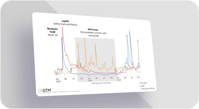 IPO Frenzy Old companies, unicorns, and overvalued! © 2022 Go To Market Partners, LLC. All rights reserved. G o o g l e T r e n d s - S e a r c h v o l u m e b y t o p i c Layoffs Led by Small and Midsize Recession FEAR March '20