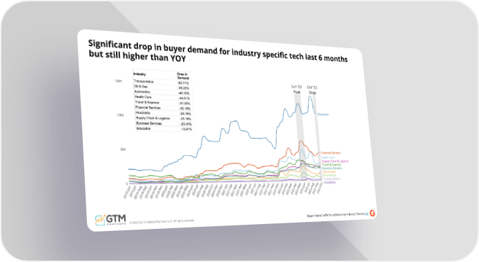 J u n ' 2 2 P e a k O c t ' 2 2 D r o p Significant drop in buyer demand for industry specific tech last 6 months but still higher than YOY © 2022 Go To Market Partners, LLC. All rights reserved. Buyer intent traffic for software by industry. Source: G2