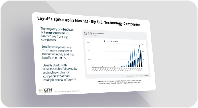 Source: https://layoffstracker.com/united-states/ Layoff's spike up in Nov '22 - Big U.S. Technology Companies The majority of ~80K laid- off employees in Oct / Nov '22 are from big companies Smaller companies are much more sensitive to market volatility and had layoffs in H1 of '22 Usually starts with business roles followed by technology roles for companies that had multiple waves of layoffs Examples: HP, Cisco, Asana, Intercom, Pipedrive, Amazon, Meta, Salesforce, Twitter, Ringcentral, Zendesk, Liveramp, Seagate, Microsoft, Fiserv, Twilio © 2022 Go To Market Partners, LLC. All rights reserved.