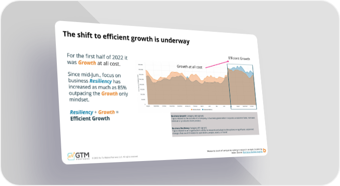 The shift to efficient growth is underway Growth at all cost Efficient Growth For the first half of 2022 it was G r o w t h at all cost. Since mid-Jun., focus on business R e s i l i e n c y has increased as much as 85% outpacing the G r o w t h only mindset. R e s i l i e n c y + G r o w t h = Efficient Growth Business Growth Category (68 signals) Topics related to the success of a company. A business grows when it expands a customer base, increases revenue or produces more product. Business Resiliency Category (81 signals) Topics related to an organization's ability to respond and adapt to disruptions or significant, unplanned changes that could threaten its operations, people, assets, or brand © 2022 Go To Market Partners, LLC. All rights reserved. Measures count of companies spiking in research on topic clusters by week. Source: Bombora Market Insight s