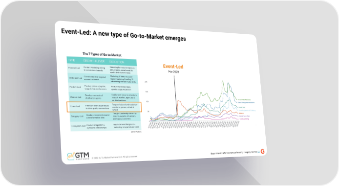 Inbound-Led TYPE Content Marketing driving to conversion channels GROWTH LEVER Marketing harvests demand via paid, organic, social, email, to qualify and route to Sales EXECUTION Outbound-Led Coordinated and targeted account outreach Marketing & Sales: Account- based marketing & selling, 1:1 advertising, content hubs, SDRs Product-Led Product-driven adoption, usage & feature discovery Product facilitates deals, upsells, usage, expansion Channel-Led Develop a network of distribution agents Enablement focus to educate & support resellers, agencies, & certified partners Event-Led Premium event experiences to drive quality connections Targeted educational roadshow events, in-person, virtual, & hybrid Category-Led Create a movement around a transformative idea Thought Leadership driven by industry experts, influencers, and happy customers @ G T M P a r t n e r s Ecosystem-Led Product integration & symbiotic relationships App & data exchanges, co- marketing, integrated use cases Event-Led: A new type of Go-to-Market emerges © 2022 Go To Market Partners, LLC. All rights reserved. Event-Led M a r 2 0 2 0 Buyer intent traffic for event software by category. Source: G2 The 7 Types of Go-to-Market
