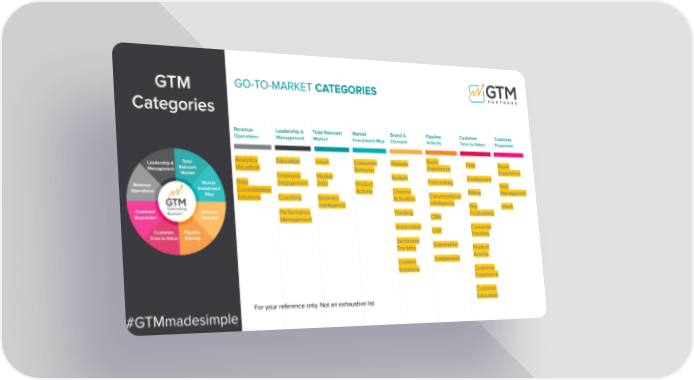 Analytics Visualizer Data Consolidation Solutions Revenue Operations Education Employee Engagement Coaching Performance Management Intent Market Data Business Intelligence Consumer Behavior Product Activity Website Budget Channel Activation Tracking Automation Sentiment Tracking Content Solutions Buyer Experience Forecasting Conversational Intelligence CRM CDP Automation Enablement Leadership & Management Total Relevant Market Market Investment Map Brand & Demand Pipeline Velocity Customer Time-to-Value Customer Expansion PRM Enablement Billing Rep Productivity Customer Tracking Product Activity Customer Experience Customer Education Buyer Experience Deal Management Intent GO-TO-MARKET CATEGORIES GTM Categories For your reference only. Not an exhaustive list #GTMmadesimple