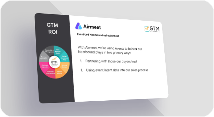 GTM ROI Event-Led Nearbound using Airmeet With Airmeet, we’re using events to bolster our Nearbound plays in two primary ways: 1. Partnering with those our buyers trust 1. Using event intent data into our sales process