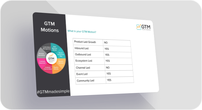What is your GTM Motion? GTM Motions Product Led Growth NO Inbound Led YES Outbound Led YES Ecosystem Led YES Channel Led NO Event Led YES Community Led YES #GTMmadesimple