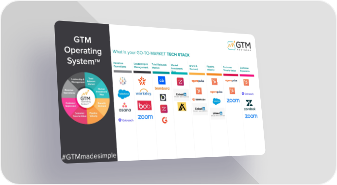 Revenue Operations Leadership & Management Total Relevant Market Market Investment Map Brand & Demand Pipeline Velocity Customer Time-to-Value Customer Expansion What is your GO-TO-MARKET TECH STACK GTM Operating System TM #GTMmadesimple