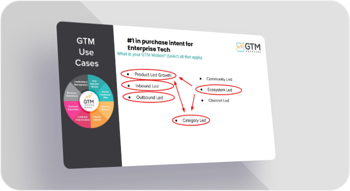 What is your GTM Motion? (Select all that apply) GTM Use Cases ● Product Led Growth ● Inbound Led ● Outbound Led ● Community Led ● Ecosystem Led ● Channel Led ● Category Led #1 in purchase intent for Enterprise Tech