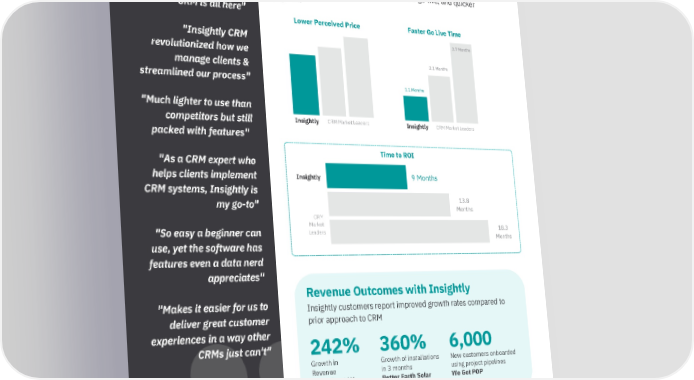 1.1 Months Insightly's ROI * Quotes and stats are from our research, customer interviews and reviews submitted through G2.com "Much lighter to use than competitors but still packed with features" "So easy a beginner can use, yet the software has features even a data nerd appreciates" "As a CRM expert who helps clients implement CRM systems, Insightly is my go-to" "Everything you need in a CRM is all here" "Makes it easier for us to deliver great customer experiences in a way other CRMs just can't" "Insightly CRM revolutionized how we manage clients & streamlined our process" QUOTABLES Compared to the CRM market leaders, customers tell us that Insightly offers friendly contract terms, faster go-live, and quicker payback Insightly customers report improved growth rates compared to prior approach to CRM 242% Growth in Revenue Sport Court LV Revenue Outcomes with Insightly 360% Growth of installations in 3 months Better Earth Solar 6,000 New customers onboarded using project pipelines We Got POP A Go-to-Market Perspective: Insightly | June 2023 Insightly CRM Market Leaders Lower Perceived Price Insightly CRM Market Leaders Faster Go Live Time 3.7 Months 2.1 Months Insightly CRM Market Leaders Time to ROI 18.3 Months 13.8 Months 9 Months