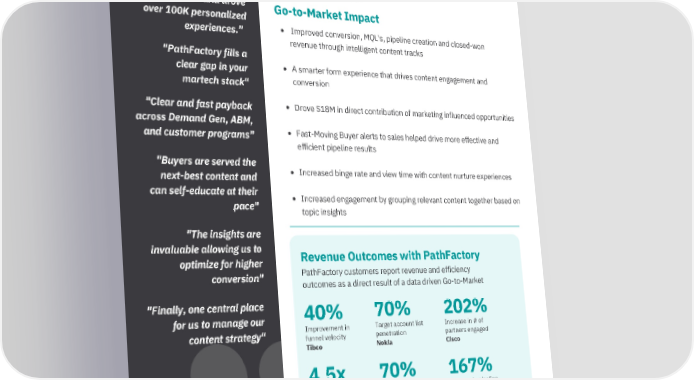 PathFactory's ROI * Quotes and stats are from our research, customer interviews and reviews submitted through G2.com "We increased customer adoption by 4.5x and drove over 100K personalized experiences." "PathFactory fills a clear gap in your martech stack" "Buyers are served the next-best content and can self-educate at their pace" "Clear and fast payback across Demand Gen, ABM, and customer programs" "Finally, one central place for us to manage our content strategy" "The insights are invaluable allowing us to optimize for higher conversion" QUOTABLES Customers see material ROI over prior approaches after implementing PathFactory. Go-to-Market Impact PathFactory customers report revenue and efficiency outcomes as a direct result of a data driven Go-to-Market 40% Improvement in funnel velocity Tibco Revenue Outcomes with PathFactory 70% Target account list penetration Nokia 202% Increase in # of partners engaged Cisco 4.5x Increased revenue from PathFactory program TrustYou 70% Improvement in closed- won deals Fiix 167% Increase in pipeline generated Bazaarvoice Improved conversion, MQL's, pipeline creation and closed-won revenue through intelligent content tracks A smarter form experience that drives content engagement and conversion Drove $18M in direct contribution of marketing influenced opportunities Fast-Moving Buyer alerts to sales helped drive more effective and efficient pipeline results Increased binge rate and view time with content nurture experiences Increased engagement by grouping relevant content together based on topic insights A Go-to-Market Perspective: PathFactory | April 2023