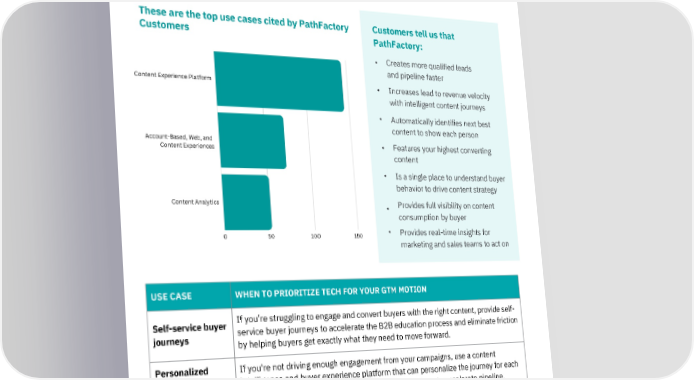 USE CASE WHEN TO PRIORITIZE TECH FOR YOUR GTM MOTION Self-service buyer journeys If you’re struggling to engage and convert buyers with the right content, provide self- service buyer journeys to accelerate the B2B education process and eliminate friction by helping buyers get exactly what they need to move forward. Personalized experiences & content strategy If you're not driving enough engagement from your campaigns, use a content intelligence and buyer experience platform that can personalize the journey for each buyer to adapt to who they are and what they care about to accelerate pipeline. Account-based buying group enablement Create shareable experiences that help champions easily educate the buying committee with customized ABM experiences while alerting sales teams with the critical intelligence data they need to accelerate deals. • • • • • In reviewing feedback from hundreds of users, we have determined that PathFactory's primary value propositions are widely experienced by their customers. Provides full visibility on content consumption by buyer Automatically identifies next best content to show each person Is a single place to understand buyer behavior to drive content strategy Provides real-time insights for marketing and sales teams to act on Features your highest converting content Customer Use Cases & Value Definition These are the top use cases cited by PathFactory Customers Customers tell us that PathFactory : A Go-to-Market Perspective: PathFactory | April 2023 0 5 0 1 0 0 1 5 0 C o n t e n t E x p e r i e n c e P l a t f o r m C o n t e n t A n a l y t i c s A c c o u n t - B a s e d , W e b , a n d C o n t e n t E x p e r i e n c e s • Increases lead to revenue velocity with intelligent content journeys • Creates more qualified leads and pipeline faster