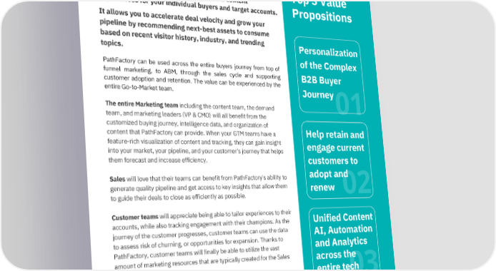 A Go-to-Market Perspective: PathFactory | April 2023 0 1 0 2 0 3 Personalization of the Complex B2B Buyer Journey Unified Content AI, Automation and Analytics across the entire tech stack Help retain and engage current customers to adopt and renew Top 3 Value Propositions PathFactory can be used across the entire buyers journey from top of funnel marketing, to ABM, through the sales cycle and supporting customer adoption and retention. The value can be experienced by the entire Go-to-Market team. The entire Marketing team including the content team, the demand team, and marketing leaders (VP & CMO) will all benefit from the customized buying journey, intelligence data, and organization of content that PathFactory can provide. When your GTM teams have a feature-rich visualization of content and tracking, they can gain insight into your market, your pipeline, and your customer's journey that helps them forecast and increase efficiency. Sales will love that their teams can benefit from PathFactory's ability to generate quality pipeline and get access to key insights that allow them to guide their deals to close as efficiently as possible. Customer teams will appreciate being able to tailor experiences to their accounts, while also tracking engagement with their champions. As the journey of the customer progresses, customer teams can use the data to assess risk of churning, or opportunities for expansion. Thanks to PathFactory, customer teams will finally be able to utilize the vast amount of marketing resources that are typically created for the Sales teams. Overall, PathFactory allows you to deliver a great experience to your current and future customers, as well as provide the Go-to-Market teams with real-time data that can drive efficiency and reduce acquisition and retention costs. PathFactory is an AI-powered content intelligence platform that allows you to generate personalized content experiences for your individual buyers and target accounts. It allows you to accelerate deal velocity and grow your pipeline by recommending next-best assets to consume based on recent visitor history, industry, and trending topics.