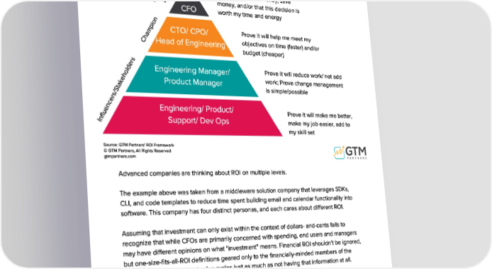 Advanced companies are thinking about ROI on multiple levels . The example above was taken from a middleware solution company tha t leverages SDKs , CLI , and code templates to reduce time spent building email and calendar functionality into software . This company has four distinct personas , and each cares about different ROI . Assuming that investment can only exist within the context of dollars - and - cents fails to recognize that while CFOs are primarily concerned with spending , end users and managers may have different opinions on what " investment " means . Financial ROI shouldn ' t be ignored , but one - size - fits - all - ROI definitions geared only to the financially - minded members of the buyer committee may hurt sales cycles just as much as not having tha t information at all . Take the time to map out your own personas and what kind of ROI might speak to each one . Sellers need to know how to win over the cha mpion and influencers . Sellers also have to arm their champion with the ROI that resonates with the economic buyer so the y can get approval from the budget holder . Matching ROI to Persona Source : GTM Partners ' ROI Framework © GTM Partners , All Rights Reserved gtmpartners . com Engineering / Product / Support / Dev Ops Engineering Manager / Product Manager CTO / CPO / Head of Engineering CEO CFO Prove it will reduce work / not add work ; Prove change management is simple / possible Prove it will make me better , make my job easier , add to my skill set Prove it will help me meet my objectives on time ( faster ) and / or budget ( cheaper ) Prove it will make money , save money , and / or that this decision is worth my time and energy Economic Buyer Champion Influencers / Stakeholders © 2023 Go To Market Partners , LLC . All rights reserved . Page 7