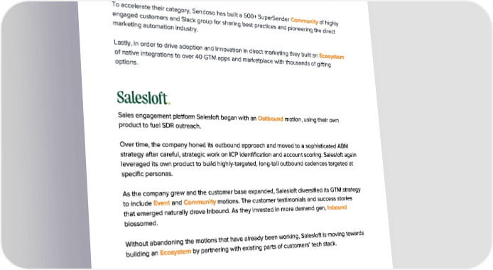 © 2023 Go To Market Partners , LLC . All rights reserved . Page 11 Sendoso sells their direct marketing automation solution with an Outbound sales motion but recently added PLG with launch of Sendoso Express to better serve the buying profile of their SMB segment . To accelerate their category , Sendoso has built a 500 + SuperSender Community of highly engaged customers and Slack group for sharing best practices and pioneering the direct marketing automation industry . Lastly , in order to drive adoption and innovation in direct marketing the y built an Ecosystem of native integrations to over 40 GTM apps and marketplace with tho usands of gifting options . Sales engagement platform Salesloft began with an Outbound motion , using their own product to fuel SDR outreach . Over time , the company honed its outbound approach and moved to a sophisticated ABM strategy after careful , strategic work on ICP identification and account scoring . Salesloft again leveraged its own product to build highly - targeted , long - tail outbound cadences targeted at specific personas . As the company grew and the customer base expanded , Salesloft diversified its GTM strategy to include Event and Community motions . The customer testimonials and success stories that emerged naturally drove Inbound . As the y invested in more demand gen , Inbound blossomed . Without abandoning the motions that have already been working , Salesloft is moving towards building an Ecosystem by partnering with existing parts of customers ’ tech stack .