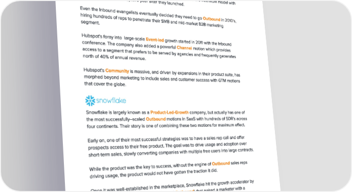 © 2023 Go To Market Partners , LLC . All rights reserved . Page 9 Hubspot cut their teeth in 2006 with the GTM motion the y invented and named : Inbound . Hubspot was also an early pioneer of Product - led growth and the freemium model with Website Grader in 2007 , just a year after the y launche d . Even the Inbound evangelists eventually decided the y need to go Outbound in 2010 ' s , hiring hundreds of reps to penetrate the ir SMB and mid - market B2B marketing segment . Hubspot ' s foray into large - scale Event - led growth started in 2011 with the Inbound conference . The company also added a powerful Channel motion which provides access to a segment that prefers to be served by agencies and frequently generates north of 40 % of annual revenue . Hubspot ' s Community is massive , and driven by expansions in the ir product suite , has morphed beyond marketing to include sales and customer success with GTM motions that cover the globe . Snowflake is largely known as a Product - Led - Growth company , but actually has one of the most successfully - - scaled Outbound motions in SaaS with hundreds of SDR ' s across four continents . Their story is one of combining the se two motions for maximum effect . Early on , one of their most successful strategies was to have a sales rep call and offer prospects access to their free product . The goal was to drive usage and adoption over short - term sales , slowly converting companies with multiple free users into large contracts . While the product was the key to success , without the engine of Outbound sales reps driving usage , the product would not have gotten the traction it did . Once it was well - established in the marketplace , Snowflake hit the growth accelerator by developing a powerful ABM ability ( part of Outbound ) that paired a marketer with a handful of reps in a region armed with a target account list . Today Snowflake continues to expand with Ecosystem and Channel motions as well .