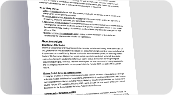 About GTM Partners Data and benchmarks collected from data providers , including G2 and Bombora , as well as our community of the world ’ s fastest - growing companies . Research , best practices , and design frameworks to provide guidance on the best - in - class approaches to strategizing , executing , and tooling your Go - to - Market approach . Personalized advice and support from experienced leaders and practitioners that help you address business challenges in a manner that is authentic and specific to you . Our consulting work focuses on areas such as Go - to - Market strategy , creating a Point of View , and Go - to - Market project execution strategy across the 8 pillars of GTM . Events and networking with industry leaders looking to define the category of Go - to - Market and revolutionize the way we create value for our organizations . About GTM Partners GTM Partners , a data - driven Go - To - Market Analyst firm helps organizations and GTM vendors to achieve efficient growth by transforming their GTM strategy . We work with high - growth companies to help them unify their GTM teams and to provide them with lasting strategies and frameworks . GTM Partners with a mission to make Go - To - Market simple aims to be the voice of the industry for all things GTM . We do this by offering : 1 . 2 . 3 . 4 . About the analysts Bryan Brown , Chief Analyst Bryan is a SaaS pioneer and thought leader in the marketing and sales tech industry . He has both created and brought to market innovative software products and ideas while helping thousands of companies in their effort to grow revenue more efficiently . Bryan is a co - founder with multiple exits ( Vtrenz ) has led strategy teams in Fortune 100 Companies ( IBM ) and has helped multiple organizations scale their products & Go - to - Market approaches from point solutions to platforms via organic product development and through mergers & acquisitions ( Silverpop , Terminus ) . His work over the years has been instrumental in forming new categories and securing top placements for his companies in both the Forrester WAVE and Gartner Magic Quadrant reports . Lindsay Cordell , Senior Go - To - Market Analyst Lindsay is a practitioner turned analyst who studies best practices and trends in Go - to - Market and develops actionable models and blueprints for our clients . She has held both practitioner and leadership roles in almost every aspect of Go - to - Market , including Product , Marketing , Sales , Revenue Operations , and Enablement for several Fortune 500 companies , including AT & T , Hearst , and Cox . She most recently ran the GTM Center of Excellence for the Account - Based Marketing Platform Solution Terminus . Sangram Vajre , Co - founder and CEO Sangram is a three - time best - selling author and co - founder of several organizations , including Terminus , The Peak Community , and most recently , GTM Partners . Sangram has been at the forefront of B2B marketing trends , the Flip - my - Funnel movement , and defining the Account - Based Marketing category , ushering in a new generation of marketers . He has previously held CMO roles at Pardot , a Salesforce company , and Terminus . To find out how GTM Partners can help you with efficient growth and revenue , contact us at analyst @ gtmpartners . com or visit our website at https : / / gtmpartners . com / © 2023 Go To Market Partners , LLC . All rights reserved . Page 14
