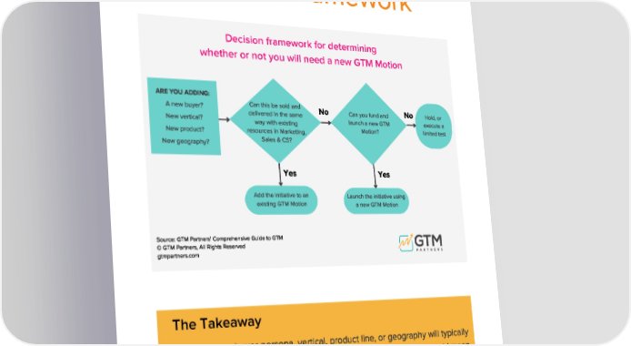 GTM Motion Investment Framework Add the initiative to an existing GTM Motion Can you fund and launch a new GTM Motion ? Launch the initiative using a new GTM Motion Hold , or execute a limited test D e c i s i o n f r a m e w o r k f o r d e t e r m i n i n g w h e t h e r o r n o t y o u w i l l n e e d a n e w G T M M o t i o n ARE YOU ADDING : A new buyer ? New vertical ? New product ? New geography ? Can this be sold and delivered in the same way with existing resources in Marketing , Sales & CS ? Yes Yes No No Source : GTM Partners ' Comprehensive Guide to GTM © GTM Partners , All Rights Reserved gtmpartners . com T h e T a k e a w a y Adding a new buyer persona , vertical , product line , or geography will typically require new investment . This could mean net new resources , or it could mean restructuring and reallocating your existing resources away from a less profitable revenue source in order to drive a new one . © 2023 Go To Market Partners , LLC . All rights reserved . Page 5