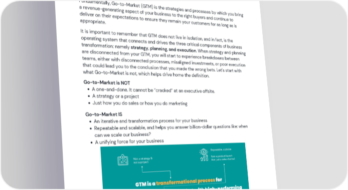 A New Definition for Go-to-Market Fundamentally, Go-to-Market (GTM) is the strategies and processes by which you bring a revenue-generating aspect of your business to the right buyers and continue to deliver on their expectations to ensure they remain your customers for as long as is appropriate. It is important to remember that GTM does not live in isolation, and in fact, is the operating system that connects and drives the three critical components of business transformation; namely strategy, planning, and execution. When strategy and planning are disconnected from your GTM, you will start to experience breakdowns between teams, either with disconnected processes, misaligned investments, or poor execution that could lead you to the conclusion that you made the wrong bets. Let's start with what Go-to-Market is not, which helps drive home the definition. Go-to-Market is NOT A one-and-done. It cannot be “cracked” at an executive offsite. A strategy or a project Just how you do sales or how you do marketing Go-to-Market IS An iterative and transformation process for your business Repeatable and scalable, and helps you answer billion-dollar questions like: when can we scale our business? A unifying force for your business @GTM Partners © 2022 Go To Market Partners, LLC. All rights reserved.