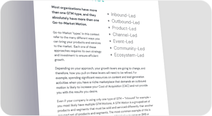 The 7 Types of Go-to-Market Most organizations have more Inbound-Led than one GTM type, and they absolutely have more than one Outbound-Led Go-to-Market Motion. Product-Led Channel-Led Go-to-Market "types" in this context refer to the many different ways you Event-Led can bring your products and services to the market. Each one of these Community-Led approaches requires its own strategy Ecosystem-Led and investment to ensure efficient growth. Depending on your approach, your growth levers are going to change, and therefore, how you pull on these levers will need to be refined. For example, spending significant resources on content and lead generation activities when you have a niche marketplace that demands an outbound motion is likely to increase your Cost of Acquisition (CAC) and not provide you with the results you desire. Even if your company is using only one type of GTM – “Inbound” for example – you most likely have multiple GTM Motions. A GTM Motion is a grouped set of products and segments that must be sold and serviced differently than another grouped set of products and segments. The most common example of this is when you see a company set up a different GTM Motion to serve an SMB or velocity segment vs. that of an enterprise segment. Why? Because the needs of the buyer and the requirements placed upon the GTM teams are so different that they can not be successful when assigned to the same resources. © 2022 Go To Market Partners, LLC. All rights reserved.