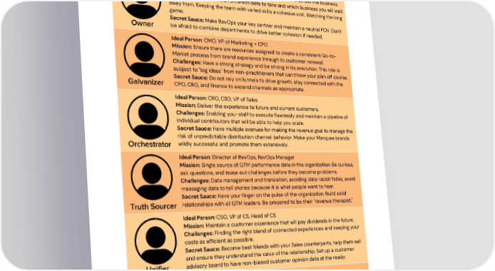 The following chart outlines the makeup of an ideal GTM team. Depending on the size of your organization, you may have different titles or individuals wearing multiple hats, but making sure you have all areas represented is critical to your GTM success. Ideal Person: CEO, GM, or Division Head Mission: Align the executive team with incentives and KPIs across the business. Challenges: Final decision on which bets to take and which business you will walk away from. Keeping the team with varied skills a cohesive unit. Watching the long game. Secret Sauce: Make RevOps your key partner and maintain a neutral POV. Don't be afraid to combine departments to drive better cohesion if needed. Owner Ideal Person: CMO, VP of Marketing + CPO Mission: Ensure there are resources assigned to create a consistent Go-to- Market process from brand experience through to customer renewal. Challenges: Have a strong strategy and be strong in its execution. This role is subject to "big ideas" from non-practitioners that can throw your plan off course. Secret Sauce: Do not rely on funnels to drive growth, stay connected with the Galvanizer CPO, CRO, and finance to expand channels as appropriate. Ideal Person: CRO, CSO, VP of Sales Mission: Deliver the experience to future and current customers. Challenges: Enabling your staff to execute flawlessly and maintain a pipeline of individual contributors that will be able to help you scale. Secret Sauce: Have multiple avenues for making the revenue goal to manage the risk of unpredictable distribution channel behavior. Make your Marquee brands wildly successful and promote them extensively. Orchestrator Ideal Person: Director of RevOps, RevOps Manager Mission: Single source of GTM performance data in the organization. Be curious, ask questions, and tease out challenges before they become problems. Challenges: Data management and translation, avoiding data rabbit holes, avoid massaging data to tell stories because it is what people want to hear. Secret Sauce: Have your finger on the pulse of the organization. Build solid relationships with all GTM leaders. Be prepared to be their "revenue therapist." Truth Sourcer Ideal Person: CSO, VP of CS, Head of CS Mission: Maintain a customer experience that will pay dividends in the future. Challenges: Finding the right blend of connected experiences and keeping your costs as efficient as possible. Secret Sauce: Become best friends with your Sales counterparts, help them sell and ensure they understand the value of the relationship. Set up a customer advisory board to have non-biased customer opinion data at the ready. Unifier Ideal Person: Head of Enablement, VP of Enablement Mission: Understand each role in the GTM team and educate on strategy changes. Be the source of knowledge for your GTM executives and ICs. Challenges: Find the balance of maintaining the speed while not overwhelming your teams with change. Secret Sauce: Keep your finger on the pulse of ICs. Create strong onboarding programs to gain trust early and understand information uptake speeds. Enabler @GTM Partners © 2022 Go To Market Partners, LLC. All rights reserved.