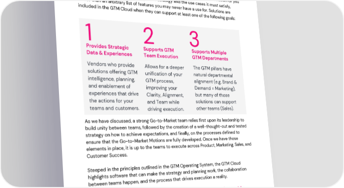 The Go-to-Market Cloud The GTM Cloud represents the software solutions that align with the 8 pillars of the GTM Operating System. In defining the characteristics of the cloud, we wanted to ensure that we never did a blanket "stack ranking" of the vendors. The right software solution for you has much more to do with your specific strategy and the use cases it must satisfy, rather than an arbitrary list of features you may never have a use for. Solutions are included in the GTM Cloud when they can support at least one of the following goals: 2 1 3 Provides Strategic Supports Multiple Supports GTM Data & Experiences GTM Departments Team Execution Vendors who provide The GTM pillars have Allows for a deeper solutions offering GTM natural departmental unification of your intelligence, planning, alignment (e.g. Brand & GTM process, and enablement of Demand = Marketing), improving your experiences that drive but many of those Clarity, Alignment, the actions for your solutions can support and Team while teams and customers. other teams (Sales). driving execution. As we have discussed, a strong Go-to-Market team relies first upon its leadership to build unity between teams, followed by the creation of a well-thought-out and tested strategy on how to achieve expectations, and finally, on the processes defined to ensure that the Go-to-Market Motions are fully developed. Once we have those elements in place, it is up to the teams to execute across Product, Marketing, Sales, and Customer Success. Steeped in the principles outlined in the GTM Operating System, the GTM Cloud highlights software that can make the strategy and planning work, the collaboration between teams happen, and the process that drives execution a reality. Using data from G2, we aligned the following categories (see table below) to G2's category definitions to observe recent trends for how B2B professionals research, adopt, and get value from their Go-to- Market technology investments. © 2022 Go To Market Partners, LLC. All rights reserved.