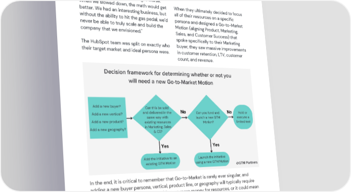 According to HubSpot, "We were acquiring Their well-intended but unfocused customers for approximately $10k, and we strategy, processes, and execution failed were getting a total lifetime value of to meet the needs of either buyer or approximately $25k. We bounced around in customer segment, which led to sluggish that range for years. When we hit the gas results. (hired faster), the math would get worse. When we slowed down, the math would get When they ultimately decided to focus better. We had an interesting business, but all of their resources on a specific without the ability to hit the gas pedal, we’d persona and designed a Go-to-Market never be able to truly scale and build the Motion (aligning Product, Marketing, company that we envisioned." Sales, and Customer Success) that spoke specifically to their Marketing The HubSpot team was split on exactly who buyer, they saw massive improvements their target market and ideal persona were. in customer retention, LTV, customer count, and revenue. Decision framework for determining whether or not you will need a new Go-to-Market Motion Add a new buyer? Can this be sold No No and delivered in the Hold or Can you fund and Add a new vertical? same way with execute a launch a new GTM Add a new product? existing resources limited test Motion? in Marketing, Sales Add a new geography? & CS? Yes Yes Add the initiative to an Launch the initiative existing GTM Motion using a new GTM Motion @GTM Partners In the end, it is critical to remember that Go-to-Market is rarely ever singular, and adding a new buyer persona, vertical, product line, or geography will typically require some level of investment. This could mean more money for resources, or it could mean strategically restructuring and reallocating your existing resources away from an existing revenue source in an effort to drive a new one. © 2022 Go To Market Partners, LLC. All rights reserved.