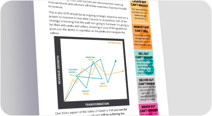 The 5 Valleys of Revenue Death If your company has a subpar GTM process, then you inevitably end up slicing the revenue pie further with each new attempt at revenue expansion (new markets or products), rather than growing the pie. CREATE BUT CAN'T MARKET When Marketing, Sales, and Success are disconnected, inserting You have launched more products and solutions will inflate expenses disproportionally a product but can’t to revenue. create enough demand for it. This is why GTM should be an ongoing strategic objective and not a 1 project or moment in time after a launch or acquisition. Part of the strategy is knowing that the path isn’t going to be linear. It's going to MARKET BUT be filled with peaks and valleys. Investing in your GTM capabilities CAN'T SELL gives you the ability to capitalize on the peaks and navigate the You are generating valleys. enough demand but can’t seem to @GTM Partners close enough sales. 2 SELL BUT CAN'T DELIVER You close customers but your customer team struggles to deliver or has to reset expectations. 3 DELIVER BUT CAN'T RENEW Your customers love your product but can’t seem to quantify the ROI enough to renew. 4 RENEW BUT One tricky aspect of the Valley of Death is that you can be CAN'T EXPAND experiencing revenue growth and still be suffering the Your customers like consequences of a failing GTM. When your teams are out of sync, what you do, but fail other teams can overcompensate and keep moving the ball to see your value forward, but inefficiently. For example, a strong marketing pipeline increase as your 5 solution improves. can cover for low sales conversion rates, and Sales can often sell ahead of product capabilities, but these are short-term fixes that @GTM Partners create a shaky foundation that you may not be able to grind your way out of. © 2022 Go To Market Partners, LLC. All rights reserved.