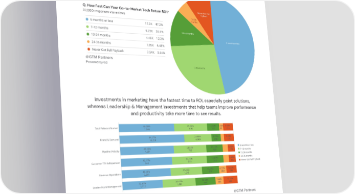 Return on Investment is critical for renewal Nearly 50% of Go-to-Market solution investments can provide their return within 6 months. Q. How Fast Can Your Go-to-Market Tech Return ROI? 37,000 responses via reviews @GTM Partners Powered by G2 Investments in marketing have the fastest time to ROI, especially point solutions, whereas Leadership & Management investments that help teams improve performance and productivity take more time to see results. @GTM Partners Powered by G2 © 2022 Go To Market Partners, LLC. All rights reserved.