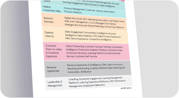 Solutions in The Go-to-Market Cloud GTM PILLAR RELEVANT CATEGORIES (EXAMPLES) Buyer Intent Data Tools, Account Data Management, Account Total Relevant Scoring, Engagement Data, Business & Sales Intelligence Market Product Management, Customer Journey Optimization Market Product Analytics Investment Map Digital Ads, Social, SEO, Marketing Automation, Lead Mgmt, Direct Brand & Mail, Event Management, Live & Managed Chat, Partner Demand Management, Account-Based Marketing, Content Exp Platforms Sales Engagement, Conversation Intelligence, Account Pipeline Intelligence, Sales Analytics, CPQ, Sales Process Experience, Velocity PRM, Demo Experience, Competitive Intelligence Customer Client Onboarding, Customer Success Training, Conversation Time-to-Value Intelligence, Production Adoption Platform, Customer Portal, Customer Advocacy, Learning Platforms, Social Customer & Customer Service, Customer Self-Service Expansion Revenue Operations & Intelligence, CRM, Lead-to-Account Revenue Matching and Routing, Analytics Platform, Data Cleansing and Operations Automation, Attribution Coaching, Employee Engagement, Learning Management Leadership & Platforms, Learning Experience Platforms, OKR, Performance Management Management, Employee Enablement @GTM Partners © 2022 Go To Market Partners, LLC. All rights reserved.