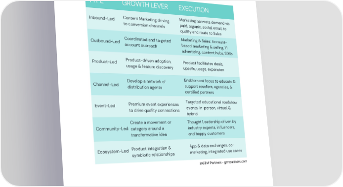 The 7 Types of Go-to-Market TYPE GROWTH LEVER EXECUTION Marketing harvests demand via Content Marketing driving Inbound-Led paid, organic, social, email, to to conversion channels qualify and route to Sales Marketing & Sales: Account- Coordinated and targeted Outbound-Led based marketing & selling, 1:1 account outreach advertising, content hubs, SDRs Product-driven adoption, Product facilitates deals, Product-Led usage & feature discovery upsells, usage, expansion Enablement focus to educate & Develop a network of Channel-Led support resellers, agencies, & distribution agents certified partners Targeted educational roadshow Premium event experiences Event-Led events, in-person, virtual, & to drive quality connections hybrid Thought Leadership driven by Create a movement or Community-Led industry experts, influencers, category around a and happy customers transformative idea App & data exchanges, co- Product integration & Ecosystem-Led marketing, integrated use cases symbiotic relationships @GTM Partners - gtmpartners.com © 2022 Go To Market Partners, LLC. All rights reserved.