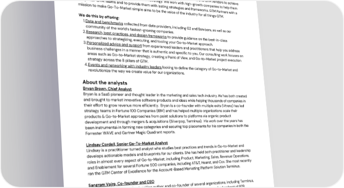 About GTM Partners About GTM Partners GTM Partners, a data-driven Go-To-Market Analyst firm helps organizations and GTM vendors to achieve efficient growth by transforming their GTM strategy. We work with high-growth companies to help them unify their GTM teams and to provide them with lasting strategies and frameworks. GTM Partners with a mission to make Go-To-Market simple aims to be the voice of the industry for all things GTM. We do this by offering: 1.Data and benchmarks collected from data providers, including G2 and Bombora, as well as our community of the world’s fastest-growing companies. 2.Research, best practices, and design frameworks to provide guidance on the best-in-class approaches to strategizing, executing, and tooling your Go-to-Market approach. 3.Personalized advice and support from experienced leaders and practitioners that help you address business challenges in a manner that is authentic and specific to you. Our consulting work focuses on areas such as Go-to-Market strategy, creating a Point of View, and Go-to-Market project execution strategy across the 8 pillars of GTM. 4.Events and networking with industry leaders looking to define the category of Go-to-Market and revolutionize the way we create value for our organizations. About the analysts Bryan Brown, Chief Analyst Bryan is a SaaS pioneer and thought leader in the marketing and sales tech industry. He has both created and brought to market innovative software products and ideas while helping thousands of companies in their effort to grow revenue more efficiently. Bryan is a co-founder with multiple exits (Vtrenz) has led strategy teams in Fortune 100 Companies (IBM) and has helped multiple organizations scale their products & Go-to-Market approaches from point solutions to platforms via organic product development and through mergers & acquisitions (Silverpop, Terminus). His work over the years has been instrumental in forming new categories and securing top placements for his companies in both the Forrester WAVE and Gartner Magic Quadrant reports. Lindsay Cordell, Senior Go-To-Market Analyst Lindsay is a practitioner turned analyst who studies best practices and trends in Go-to-Market and develops actionable models and blueprints for our clients. She has held both practitioner and leadership roles in almost every aspect of Go-to-Market, including Product, Marketing, Sales, Revenue Operations, and Enablement for several Fortune 500 companies, including AT&T, Hearst, and Cox. She most recently ran the GTM Center of Excellence for the Account-Based Marketing Platform Solution Terminus. Sangram Vajre, Co-founder and CEO Sangram is a three-time best-selling author and co-founder of several organizations, including Terminus, The Peak Community, and most recently, GTM Partners. Sangram has been at the forefront of B2B marketing trends, the Flip-my-Funnel movement, and defining the Account-Based Marketing category, ushering in a new generation of marketers. He has previously held CMO roles at Pardot, a Salesforce company, and Terminus. To find out how GTM Partners can help you with efficient growth and revenue, contact us at: Web: www.gtmpartners.com Email: analyst@gtmpartners.com © 2022 Go To Market Partners, LLC. All rights reserved.