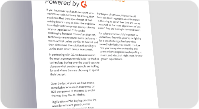 The Role of Technology in Go-to-Market Success Powered by If you have ever spoken to someone who For buyers of software, this section will markets or sells software for a living, then help you see in aggregate what the market you know that they spend most of their is choosing to spend their time and money waking hours trying to describe and show on as well as the types of problems or "use how their technology can solve problems cases" they are looking to have addressed. in your organization. This can be For software vendors, it is important to challenging because more often than not, understand that while you may be fighting technology alone cannot solve problems – for a specific budget line item, when we must first define our Go-to-Market and viewed holistically, you need to consider then determine the solution that will give how your categories are trending and us the most return on our investment. where other categories may be picking up In partnering with G2, we have reviewed steam, and what that might mean for your the most common trends in Go-to-Market growth expectations. technology buying over the past 5 years to observe what solutions people are looking for and where they are choosing to spend their budget. Over the last 4 years, we have seen a remarkable increase in awareness by B2B companies of the need to evolve the way they Go-to-Market. Digitization of the buying process, the need for efficient growth, and of course, the COVID pandemic, have accelerated the need for this Go-to- Market transformation. © 2022 Go To Market Partners, LLC. All rights reserved.