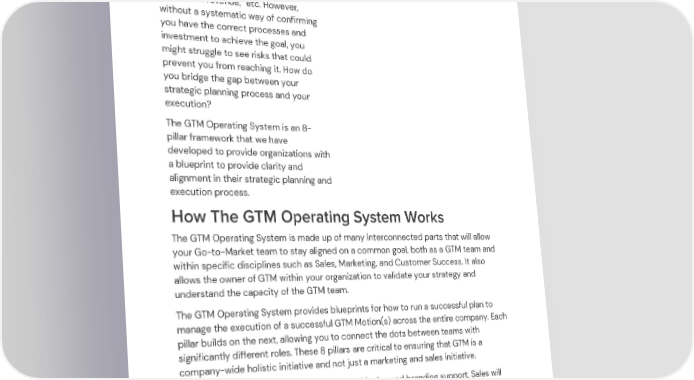 The Go-to-Market Operating System We often hear business leaders speak to the desired outcomes as though they are the plan: “We need 3X pipeline,” “Increase NRR by 3 points,” “30% increase in revenue,” etc. However, without a systematic way of confirming you have the correct processes and investment to achieve the goal, you might struggle to see risks that could prevent you from reaching it. How do you bridge the gap between your strategic planning process and your execution? The GTM Operating System is an 8- pillar framework that we have developed to provide organizations with a blueprint to provide clarity and alignment in their strategic planning and execution process. How The GTM Operating System Works The GTM Operating System is made up of many interconnected parts that will allow your Go-to-Market team to stay aligned on a common goal, both as a GTM team and within specific disciplines such as Sales, Marketing, and Customer Success. It also allows the owner of GTM within your organization to validate your strategy and understand the capacity of the GTM team. The GTM Operating System provides blueprints for how to run a successful plan to manage the execution of a successful GTM Motion(s) across the entire company. Each pillar builds on the next, allowing you to connect the dots between teams with significantly different roles. These 8 pillars are critical to ensuring that GTM is a company-wide holistic initiative and not just a marketing and sales initiative. For example, without having the correct positioning and branding support, Sales will struggle to make their numbers, or if your customers can’t see value in your solution, having your revenue depend on expansion will become a challenge for your Account teams. © 2022 Go To Market Partners, LLC. All rights reserved.