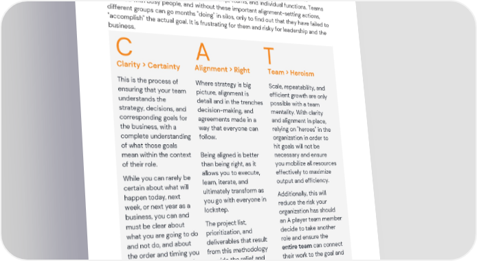 Clarity. Alignment. Team. (C.A.T.) The final framework in our Transformational Growth Business Model is all about the people, the hardworking GTM professionals we want to help work in a more effective way. In our experience, many of the issues related to Go-to-Market are due to misalignment challenges between leadership, teams, and individual functions. Teams are filled with busy people, and without these important alignment-setting actions, different groups can go months "doing" in silos, only to find out that they have failed to "accomplish" the actual goal. It is frustrating for them and risky for leadership and the business. C T A Clarity > Certainty Alignment > Right Team > Heroism This is the process of Scale, repeatability, and Where strategy is big ensuring that your team efficient growth are only picture, alignment is understands the possible with a team detail and in the trenches strategy, decisions, and mentality. With clarity decision-making, and corresponding goals for and alignment in place, agreements made in a the business, with a relying on "heroes" in the way that everyone can complete understanding organization in order to follow. of what those goals hit goals will not be mean within the context necessary and ensure Being aligned is better of their role. you mobilize all resources than being right, as it effectively to maximize allows you to execute, While you can rarely be output and efficiency. learn, iterate, and certain about what will ultimately transform as happen today, next Additionally, this will you go with everyone in week, or next year as a reduce the risk your lockstep. business, you can and organization has should must be clear about an A player team member The project list, what you are going to do decide to take another prioritization, and and not do, and about role and ensure the deliverables that result the order and timing you entire team can connect from this methodology will do it. Having a north their work to the goal and provide the relief and star allows teams and feel valued, which is an direction that your GTM individuals to make important aspect of team is craving. better decisions in their morale and mental health day-to-day to stay the at work. course for your strategy. @GTM Partners © 2022 Go To Market Partners, LLC. All rights reserved.