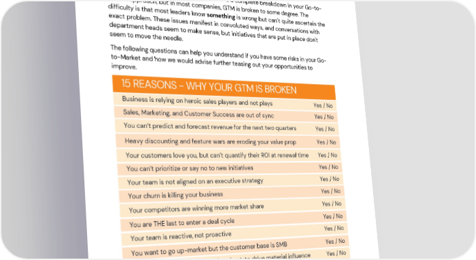 Is Your Go-to-Market Broken? In this situation, broken rarely means there is a complete breakdown in your Go-to- Market approach, but in most companies, GTM is broken to some degree. The difficulty is that most leaders know something is wrong but can’t quite ascertain the exact problem. These issues manifest in convoluted ways, and conversations with department heads seem to make sense, but initiatives that are put in place don't seem to move the needle. The following questions can help you understand if you have some risks in your Go- to-Market and how we would advise further teasing out your opportunities to improve. 15 REASONS - WHY YOUR GTM IS BROKEN Business is relying on heroic sales players and not plays Yes / No Sales, Marketing, and Customer Success are out of sync Yes / No You can’t predict and forecast revenue for the next two quarters Yes / No Yes / No Heavy discounting and feature wars are eroding your value prop Your customers love you, but can’t quantify their ROI at renewal time Yes / No You can’t prioritize or say no to new initiatives Yes / No Yes / No Your team is not aligned on an executive strategy Your churn is killing your business Yes / No Your competitors are winning more market share Yes / No You are THE last to enter a deal cycle Yes / No Yes / No Your team is reactive, not proactive Yes / No You want to go up-market but the customer base is SMB Your analyst relations are weak, at best, to drive material influence Yes / No Yes / No Your point of view is not differentiated with your product You are struggling to go from a product to a platform company Yes / No @GTM Partners If you answered yes to more than a handful of these questions, you have some potential growth risk related to your Go-to-Market that could have long-term negative impacts on your business. © 2022 Go To Market Partners, LLC. All rights reserved.