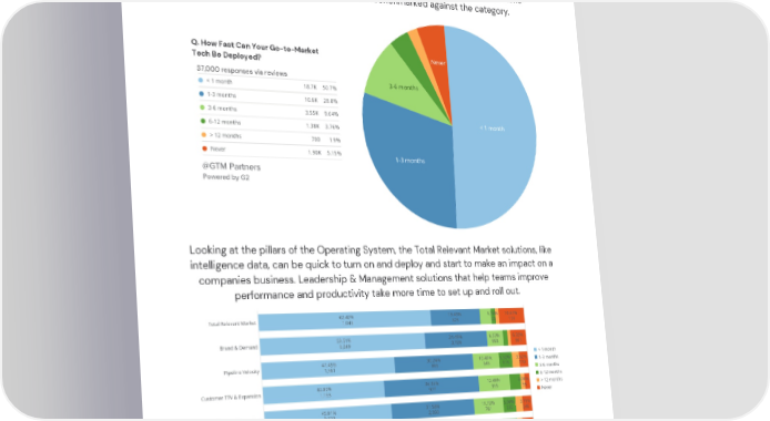 Product Usage Trends Implementation success is often linked to the customers willingness to expand the relationship specifically in competitive markets. Over half of the solutions reviewed are able to be deployed in less than 1 month. That said, a customers expected time- to-value for a given solution should be benchmarked against the category. Q. How Fast Can Your Go-to-Market Tech Be Deployed? 37,000 responses via reviews @GTM Partners Powered by G2 Looking at the pillars of the Operating System, the Total Relevant Market solutions, like intelligence data, can be quick to turn on and deploy and start to make an impact on a companies business. Leadership & Management solutions that help teams improve performance and productivity take more time to set up and roll out. @GTM Partners Powered by G2 © 2022 Go To Market Partners, LLC. All rights reserved.
