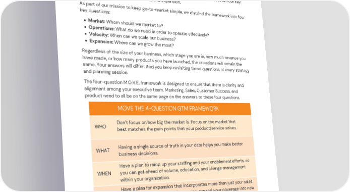 The M.O.V.E. Framework Strategy and planning processes have multiple frameworks that already exist. But GTM is about creating a transformation process and why we created the M.O.V.E. framework to help you transform and grow efficiently. The M.O.V.E. framework focuses on four key areas – market, operations, velocity, and expansion. As part of our mission to keep go-to-market simple, we distilled the framework into four key questions: Market: Whom should we market to? Operations: What do we need in order to operate effectively? Velocity: When can we scale our business? Expansion: Where can we grow the most? Regardless of the size of your business, which stage you are in, how much revenue you have made, or how many products you have launched, the questions will remain the same. Your answers will differ. And you keep revisiting these questions at every strategy and planning session. The four-question M.O.V.E. framework is designed to ensure that there is clarity and alignment among your executive team. Marketing, Sales, Customer Success, and product need to all be on the same page on the answers to these four questions. MOVE THE 4-QUESTION GTM FRAMEWORK Don’t focus on how big the market is. Focus on the market that WHO best matches the pain points that your product/service solves. Having a single source of truth in your data helps you make better WHAT business decisions. Have a plan to ramp up your staffing and your enablement efforts, so WHEN you can get ahead of volume, education, and change management within your organization. Have a plan for expansion that incorporates more than just your sales WHERE organization (e.g., partners & agencies, expand your coverage into new verticals or business types, or expand your product). @GTM Partners Your aim with your go-to-market framework should be to build a cohesive, trained, and responsive team that works together to understand, know, and serve the customer. © 2022 Go To Market Partners, LLC. All rights reserved.