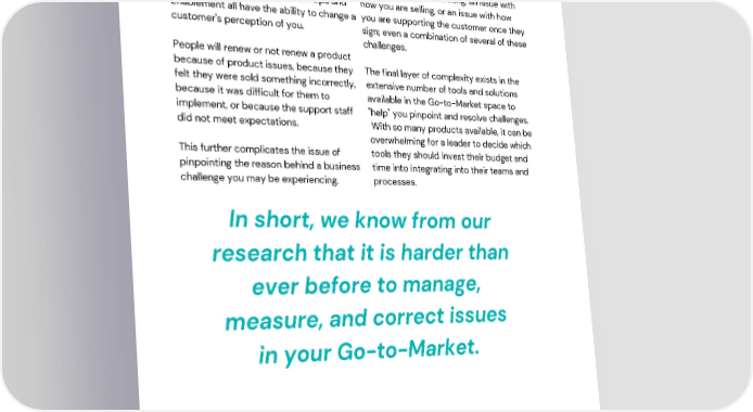 In addition to the complications within For example, if you start to see your departments, the number of departments expansion revenue decline, it could be that now have a significant stake in the because of a product issue, a messaging customer experience has also increased. and positioning issue, an issue with the Product, Marketing, Sales, Customer teams, audience you are attracting, an issue with and their supporting staff of RevOps and how you are selling, or an issue with how Enablement all have the ability to change a you are supporting the customer once they customer's perception of you. sign; even a combination of several of these challenges. People will renew or not renew a product because of product issues, because they The final layer of complexity exists in the felt they were sold something incorrectly, extensive number of tools and solutions because it was difficult for them to available in the Go-to-Market space to implement, or because the support staff "help" you pinpoint and resolve challenges. did not meet expectations. With so many products available, it can be overwhelming for a leader to decide which This further complicates the issue of tools they should invest their budget and pinpointing the reason behind a business time into integrating into their teams and challenge you may be experiencing. processes. In short, we know from our research that it is harder than ever before to manage, measure, and correct issues in your Go-to-Market. © 2022 Go To Market Partners, LLC. All rights reserved.