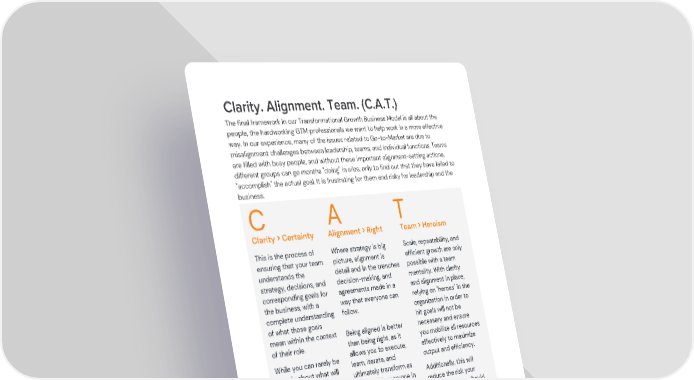Clarity. Alignment. Team. (C.A.T.) The final framework in our Transformational Growth Business Model is all about the people, the hardworking GTM professionals we want to help work in a more effective way. In our experience, many of the issues related to Go-to-Market are due to misalignment challenges between leadership, teams, and individual functions. Teams are filled with busy people, and without these important alignment-setting actions, different groups can go months "doing" in silos, only to find out that they have failed to "accomplish" the actual goal. It is frustrating for them and risky for leadership and the business. C T A Clarity > Certainty Alignment > Right Team > Heroism This is the process of Scale, repeatability, and Where strategy is big ensuring that your team efficient growth are only picture, alignment is understands the possible with a team detail and in the trenches strategy, decisions, and mentality. With clarity decision-making, and corresponding goals for and alignment in place, agreements made in a the business, with a relying on "heroes" in the way that everyone can complete understanding organization in order to follow. of what those goals hit goals will not be mean within the context necessary and ensure Being aligned is better of their role. you mobilize all resources than being right, as it effectively to maximize allows you to execute, While you can rarely be output and efficiency. learn, iterate, and certain about what will ultimately transform as happen today, next Additionally, this will you go with everyone in week, or next year as a reduce the risk your lockstep. business, you can and organization has should must be clear about an A player team member The project list, what you are going to do decide to take another prioritization, and and not do, and about role and ensure the deliverables that result the order and timing you entire team can connect from this methodology will do it. Having a north their work to the goal and provide the relief and star allows teams and feel valued, which is an direction that your GTM individuals to make important aspect of team is craving. better decisions in their morale and mental health day-to-day to stay the at work. course for your strategy. @GTM Partners © 2022 Go To Market Partners, LLC. All rights reserved.