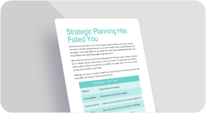 Strategic Planning Has Failed You Does this sound familiar to you? A new revenue target has been set for the company. You have to 3X the existing revenue. So you do the math. Work yourself backward from the target – how many leads do you need? How many new salespeople will need to be hired? What’s the marketing budget to get there, etc.? Well, what if we told you this is the wrong approach? Hitting a revenue target is all about Go-to-Market, and you can’t math your way out of this. If you approach revenue like a math problem, chances are slim that you will hit your target; even if you do, you will be cutting a lot of corners to get there. "Mathing" your way to a revenue target is just one of the go-to-market biases that exist in the B2B tech industry. There are several more. GTM BIASES – THE 5 "ISMS" Mathism Spreadsheet over strategy Incrementalism Risk aversion over decision-making Departmentalism Team outcomes prioritized over customer experience Growthism Short-term wins at the cost of long-term planning Sizism Future possibility over near-term reality @GTM Partners These biases stem from the poor way in which companies approach annual strategic planning, targets, and goals. By focusing their efforts on the issues within departments, they miss the real issue – annual planning should start with strategy conversations and the trade-offs that must occur at a company level long before you ever discuss what will happen in each department. Remember, the goal of GTM is to acquire, keep, and grow customer relationships – this kind of thinking can not be done in a spreadsheet, like the ones that produce the growth percentage target that is typically handed down to departmental leaders from finance. © 2022 Go To Market Partners, LLC. All rights reserved.