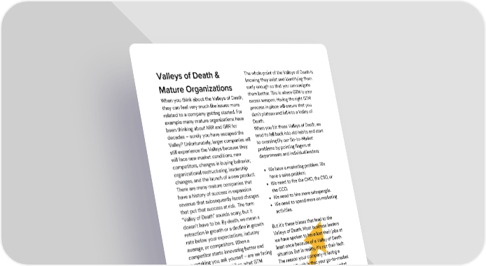 The whole point of the Valleys of Death is Valleys of Death & knowing they exist and identifying them early enough so that you can navigate Mature Organizations them better. This is where GTM is your When you think about the Valleys of Death, secret weapon. Having the right GTM they can feel very much like issues more process in place will ensure that you related to a company getting started. For don’t plateau and fall into a Valley of example many mature organizations have Death. been thinking about NRR and GRR for When you hit these Valleys of Death, we decades – surely you have escaped the tend to fall back into old habits and start Valley? Unfortunately, larger companies will to oversimplify our Go-to-Market still experience the Valleys because they problems by pointing fingers at will face new market conditions, new departments and individual leaders: competitors, changes in buying behavior, organizational restructuring, leadership We have a marketing problem. We changes, and the launch of a new product. have a sales problem. There are many mature companies that We need to fire the CMO, the CRO, or have a history of success in expansion the CCO. revenue that subsequently faced changes We need to hire more salespeople. that put that success at risk. The term We need to spend more on marketing “Valley of Death” sounds scary, but it activities. doesn’t have to be. By death, we mean a retraction in growth or a decline in growth But it's these biases that lead to the rate below your expectations, industry Valleys of Death. Most business leaders average, or competitors. When a we have spoken to have lost their jobs at competitor starts innovating better and least once because of a Valley of Death overtaking you, ask yourself – are we facing situation. But in reality, it's not their fault. a Valley of Death, and if so, what GTM The reason your company is facing a transformation is required to successfully Valley of Death is that your go-to-market navigate through it? is broken, and you have a go-to-market problem. © 2022 Go To Market Partners, LLC. All rights reserved.