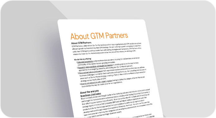 About GTM Partners About GTM Partners GTM Partners, a data-driven Go-To-Market Analyst firm helps organizations and GTM vendors to achieve efficient growth by transforming their GTM strategy. We work with high-growth companies to help them unify their GTM teams and to provide them with lasting strategies and frameworks. GTM Partners with a mission to make Go-To-Market simple aims to be the voice of the industry for all things GTM. We do this by offering: 1.Data and benchmarks collected from data providers, including G2 and Bombora, as well as our community of the world’s fastest-growing companies. 2.Research, best practices, and design frameworks to provide guidance on the best-in-class approaches to strategizing, executing, and tooling your Go-to-Market approach. 3.Personalized advice and support from experienced leaders and practitioners that help you address business challenges in a manner that is authentic and specific to you. Our consulting work focuses on areas such as Go-to-Market strategy, creating a Point of View, and Go-to-Market project execution strategy across the 8 pillars of GTM. 4.Events and networking with industry leaders looking to define the category of Go-to-Market and revolutionize the way we create value for our organizations. About the analysts Bryan Brown, Chief Analyst Bryan is a SaaS pioneer and thought leader in the marketing and sales tech industry. He has both created and brought to market innovative software products and ideas while helping thousands of companies in their effort to grow revenue more efficiently. Bryan is a co-founder with multiple exits (Vtrenz) has led strategy teams in Fortune 100 Companies (IBM) and has helped multiple organizations scale their products & Go-to-Market approaches from point solutions to platforms via organic product development and through mergers & acquisitions (Silverpop, Terminus). His work over the years has been instrumental in forming new categories and securing top placements for his companies in both the Forrester WAVE and Gartner Magic Quadrant reports. Lindsay Cordell, Senior Go-To-Market Analyst Lindsay is a practitioner turned analyst who studies best practices and trends in Go-to-Market and develops actionable models and blueprints for our clients. She has held both practitioner and leadership roles in almost every aspect of Go-to-Market, including Product, Marketing, Sales, Revenue Operations, and Enablement for several Fortune 500 companies, including AT&T, Hearst, and Cox. She most recently ran the GTM Center of Excellence for the Account-Based Marketing Platform Solution Terminus. Sangram Vajre, Co-founder and CEO Sangram is a three-time best-selling author and co-founder of several organizations, including Terminus, The Peak Community, and most recently, GTM Partners. Sangram has been at the forefront of B2B marketing trends, the Flip-my-Funnel movement, and defining the Account-Based Marketing category, ushering in a new generation of marketers. He has previously held CMO roles at Pardot, a Salesforce company, and Terminus. To find out how GTM Partners can help you with efficient growth and revenue, contact us at: Web: www.gtmpartners.com Email: analyst@gtmpartners.com © 2022 Go To Market Partners, LLC. All rights reserved.