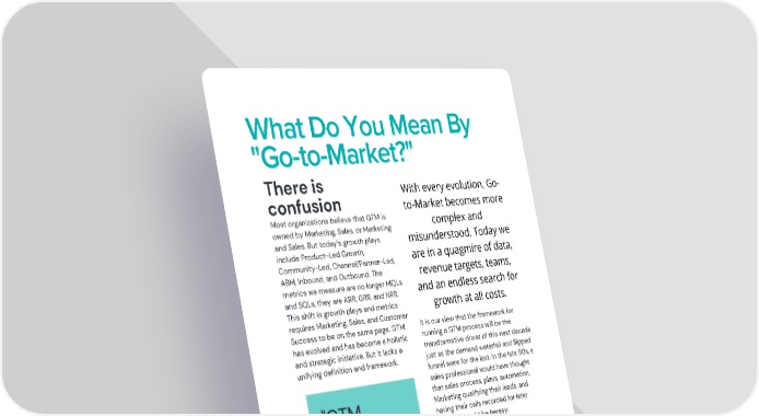 What Do You Mean By "Go-to-Market?" There is With every evolution, Go- confusion to-Market becomes more Most organizations believe that GTM is complex and owned by Marketing, Sales, or Marketing and Sales. But today’s growth plays misunderstood. Today we include Product-Led Growth, are in a quagmire of data, Community-Led, Channel/Partner-Led, ABM, Inbound, and Outbound. The revenue targets, teams, metrics we measure are no longer MQLs and an endless search for and SQLs, they are ARR, GRR, and NRR. This shift in growth plays and metrics growth at all costs. requires Marketing, Sales, and Customer It is our view that the framework for Success to be on the same page. GTM running a GTM process will be the has evolved and has become a holistic transformative driver of this next decade, and strategic initiative. But it lacks a just as the demand waterfall and flipped unifying definition and framework. funnel were for the last. In the late 90s, a sales professional would have thought that sales process, plays, automation, Marketing qualifying their leads, and "GTM having their calls recorded for later coaching would be heresy. belongs to So (not without resistance), we believe Marketing the unification of the GTM functions or Sales" (Marketing, Sales, Success, Service, RevOps, Enablement, and Product) under a GTM process (not an org chart) will allow B2B companies to execute more strategically, outmaneuver their 77% competitors, expand their markets, and drive customer lifetime value to new 1,000+ B2B Professionals heights. @GTM Partners © 2022 Go To Market Partners, LLC. All rights reserved.