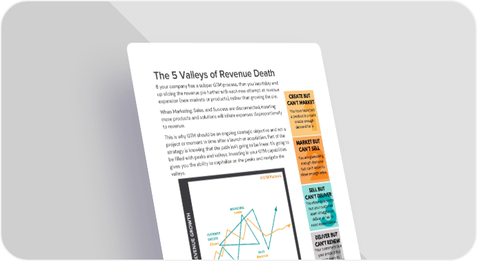 The 5 Valleys of Revenue Death If your company has a subpar GTM process, then you inevitably end up slicing the revenue pie further with each new attempt at revenue expansion (new markets or products), rather than growing the pie. CREATE BUT CAN'T MARKET When Marketing, Sales, and Success are disconnected, inserting You have launched more products and solutions will inflate expenses disproportionally a product but can’t to revenue. create enough demand for it. This is why GTM should be an ongoing strategic objective and not a 1 project or moment in time after a launch or acquisition. Part of the strategy is knowing that the path isn’t going to be linear. It's going to MARKET BUT be filled with peaks and valleys. Investing in your GTM capabilities CAN'T SELL gives you the ability to capitalize on the peaks and navigate the You are generating valleys. enough demand but can’t seem to @GTM Partners close enough sales. 2 SELL BUT CAN'T DELIVER You close customers but your customer team struggles to deliver or has to reset expectations. 3 DELIVER BUT CAN'T RENEW Your customers love your product but can’t seem to quantify the ROI enough to renew. 4 RENEW BUT One tricky aspect of the Valley of Death is that you can be CAN'T EXPAND experiencing revenue growth and still be suffering the Your customers like consequences of a failing GTM. When your teams are out of sync, what you do, but fail other teams can overcompensate and keep moving the ball to see your value forward, but inefficiently. For example, a strong marketing pipeline increase as your 5 solution improves. can cover for low sales conversion rates, and Sales can often sell ahead of product capabilities, but these are short-term fixes that @GTM Partners create a shaky foundation that you may not be able to grind your way out of. © 2022 Go To Market Partners, LLC. All rights reserved.