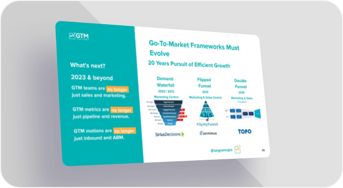 GTM teams are no longer just sales and marketing. GTM metrics are no longer just pipeline and revenue. GTM motions are no longer just inbound and ABM. What’s next? 2023 & beyond Go-To-Market Frameworks Must Evolve 20 Years Pursuit of Efficient Growth Flipped Funnel 2015 Marketing & Sales Centric Demand Waterfall 2002 | 2012 Marketing Centric 09 Double Funnel 2018 Marketing & Sales Centric @sangramvajre
