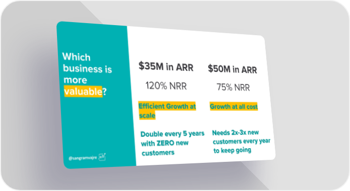 Which business is more valuable ? $35M in ARR $50M in ARR 120% NRR 75% NRR Growth at all cost Needs 2x-3x new customers every year to keep going Efficient Growth at scale Double every 5 years with ZERO new customers @sangramvajre