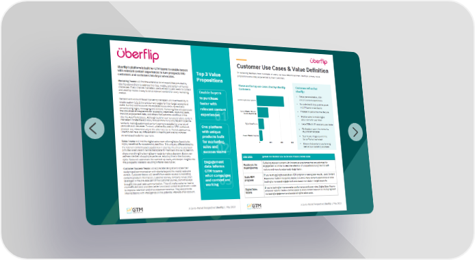A Go-to-Market Perspective: Uberflip | May 2023 0 1 0 2 0 3 Enable buyers to purchase faster with relevant content experiences Engagement data informs GTM teams what campaigns and content are working One platform with unique products built for marketing, sales and success teams Top 3 Value Propositions Uberflip’s platform is built for GTM teams to enable buyers with relevant content experiences to turn prospects into customers and customers into loyal advocates. Marketing Teams will find the extensive list of capabilities provided by Uberflip allows them to address their top, middle, and bottom-of-funnel challenges. Every channel marketers use to attract buyers leads to content and Uberflip makes it easy to serve relevant content for every marketing motion. Demand and Account Based Marketing managers will love the ability to create custom 1:1, 1:few and 1:many pages for their target accounts at scale, turning cold accounts into engaged accounts by dynamically personalizing logos, messaging and content. Marketing Ops will appreciate the robust set of integrations for leveraging intent data, capturing leads, tracking engagement data, and others that optimize workflows in the Uberflip App Marketplace. Although built for journey acceleration, content marketers initiate the ROI story through tools to quickly tag and organize content, making customized content journeys scalable for a variety of personas and use cases. In short, whether focused on ABM, outbound, product-led, inbound or any of the other key Go-to-Market approaches, Uberflip can be a key differentiator in creating and scaling complex personalized customer journeys. Sales Teams will find the digital sales room offering Sales Assist to be highly beneficial for accelerating deal flow. It is uniquely differentiated by the relevant content asset capabilities in Uberflip.The chrome extension provides a secure and centralized space for members of a selling team to share everything the buying team needs to make a decision. Buyers can self-service their shopping experience, reducing time in the discovery cycle. Sales will appreciate the warmed-up leads, and deeper insights into the prospects interests resulting in faster deal cycles. Customer Success Teams will appreciate being able to scale their customized communication with clients beyond the weekly calls and emails. Customer teams will benefit from easier access to marketing content (product information, customer stories, company news) often leveraged in the pre-sale part of the customer journey, but not always brought into post-sale communication. This will make customer teams more efficient and provide a better brand and content experience in order to improve retention and drive expansion revenue. They also provide internal teams with intelligence on the potential interests of an account.